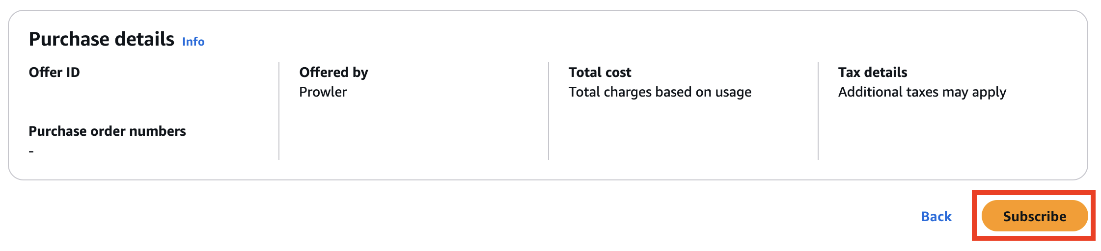 To get to the Prowler Cloud product listing in the AWS Marketplace, and click theView purchase options button: