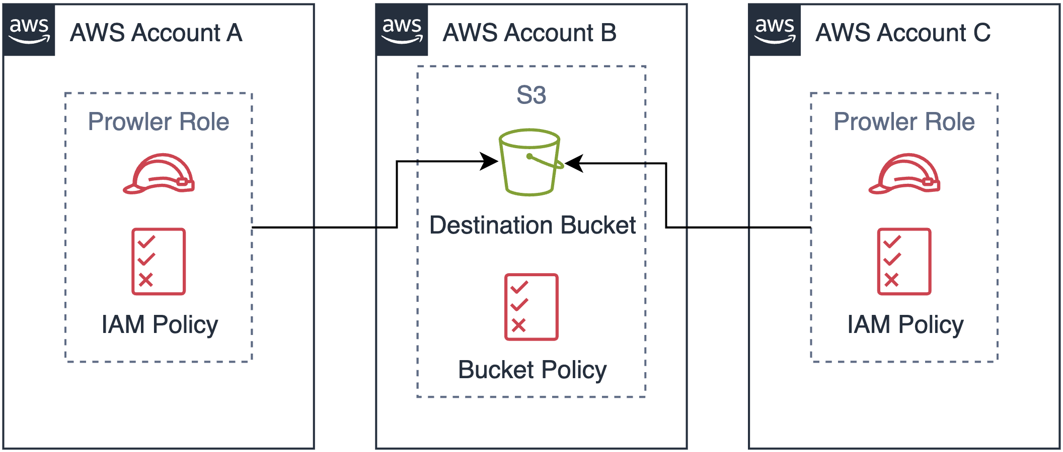 <SOURCE ACCOUNT ID> with the AWS account ID that contains the IAM role and <BUCKET NAME> with the destination bucket name. The role name ProwlerScan is the default name when using Prowler’s permissions templates. If using a custom IAM role or different authentication method, replace ProwlerScan with the actual role name.Multi-Account Configuration